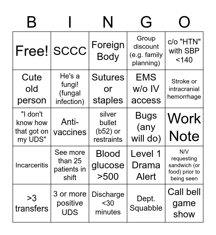 This bingo card has 70 words: Got "Pam-med", Work Note, "My veins roll" or "I'm a hard stick", Refused Covid swabs, 3 or more positive UDS, He-bola, Man Flu, or Bro-chitis, Group discount (e.g. family planning), MVA, c/o "HTN" with SBP <140, Walkie- talkie chest pain, N/V requesting sandwich (or food) prior to being seen, Left AMA or LWBS, Free!, Foreign Body, Code Blue, Anti-vaccines, Blood glucose >500, EMS w/o IV access, >5 EMS intake per shift, Incarceritis, Bugs (any will do), Level 1 Drama Alert, Stroke or intracranial hemorrhage, Get in the choppah!, Houston House Special, STEMI, Code Brown, "It's shift change", Dept. Squabble, Pt back in <24 hours, SCCC, ETOH >300, Emotional Support Chihuahua (or small animal), "It's all in my chart", Has tattoos but hates needles, 5+ "allergies", SI/HI, On phone during triage, Poison Ivy, Cute old person, Call bell game show, See more than 25 patients in shift, silver bullet (b52) or restraints, Cute old couple, Overdose, He's a fungi! (fungal infection), >3 transfers, Has PCP/clinic appt tomorrow, Ultrasound IV, RSI, Moderate Sedation, Blood cultures x2, Pain 12+/10, Overtime Shift, Discharge <30 minutes, SBP >215, Sutures or staples, I&D, Partial or complete amputation, Nursing home takeback, "I don't know how that got on my UDS", ESI 5, Patient Dump, Animal bite, Sepsis work-up, Cookie Monster pajama pants, Meds in a grocery bag, "Allergic" to NSAIDS, School Note and Brings in fast food.