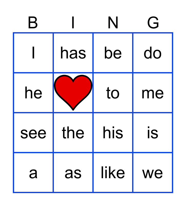 This bingo card has 1 images and 15 words: a, as, be, do, he, has, his, is, I, like, me, see, the, to and we.