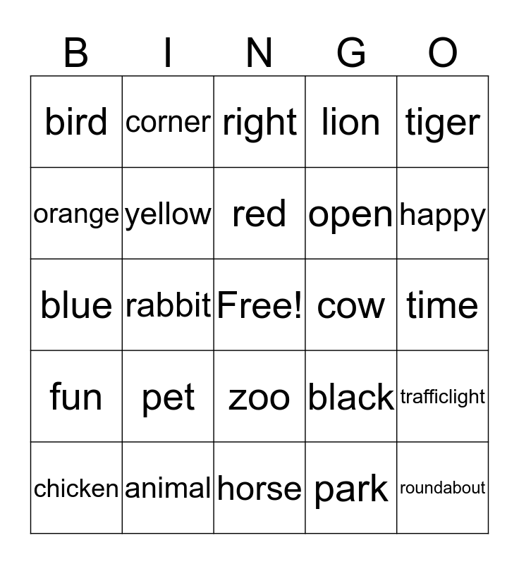This bingo card has a free space and 24 words: pet, animal, red, chicken, tiger, bird, orange, corner, cow, zoo, open, blue, black, trafficlight, yellow, park, time, right, happy, rabbit, roundabout, fun, lion and horse.