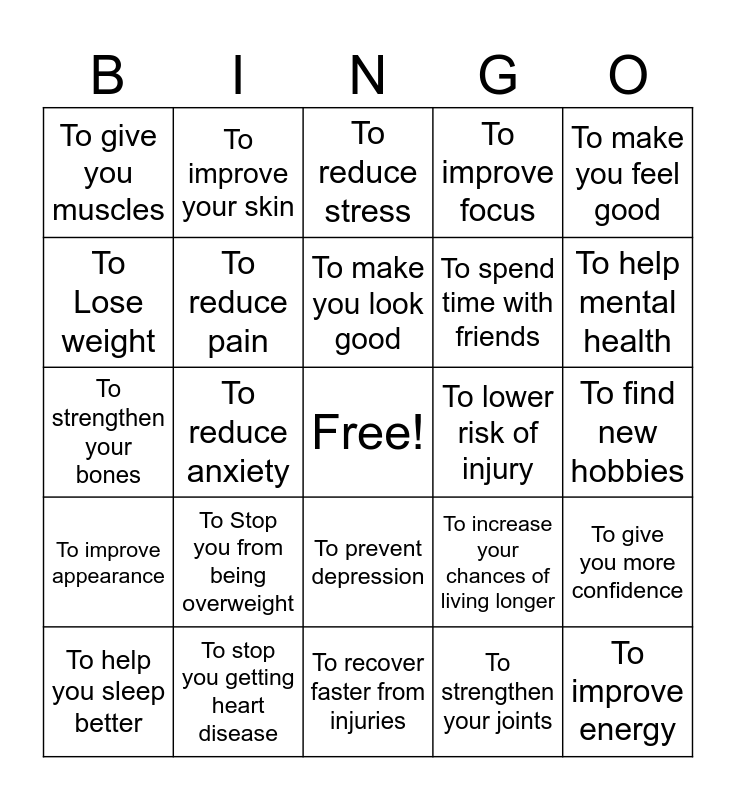 This bingo card has a free space and 24 words: To Stop you from being overweight, To stop you getting heart disease, To make you look good, To help you sleep better, To make you feel good, To give you muscles, To Lose weight, To improve your skin, To lower risk of injury, To prevent depression, To spend time with friends, To strengthen your bones, To increase your chances of living longer, To give you more confidence, To reduce pain, To strengthen your joints, To find new hobbies, To reduce stress, To help mental health, To reduce anxiety, To improve energy, To improve appearance, To improve focus and To recover faster from injuries.