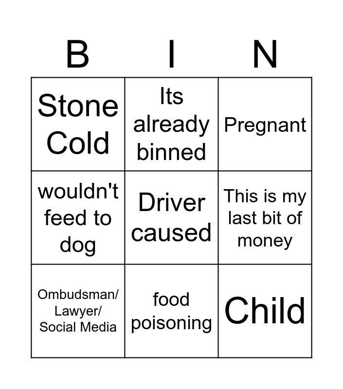 This bingo card has 9 words: Ombudsman/ Lawyer/ Social Media, Pregnant, Its already binned, wouldn't feed to dog, Stone Cold, This is my last bit of money, Driver caused, Child and food poisoning.