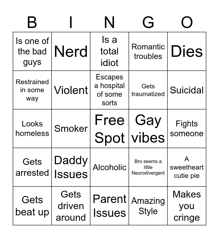 This bingo card has a free space and 24 words: Daddy Issues, Gets driven around, Escapes a hospital of some sorts, Gets beat up, Dies, Is one of the bad guys, Restrained in some way, Nerd, Gay vibes, Alcoholic, Gets traumatized, Looks homeless, Bro seems a little Neurodivergent, A sweetheart cutie pie, Violent, Amazing Style, Fights someone, Is a total idiot, Suicidal, Smoker, Makes you cringe, Gets arrested, Romantic troubles and Parent Issues.
