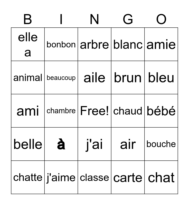 This bingo card has a free space and 24 words: à, j'aime, aile, chatte, amie, elle a, animal, bonbon, chaud, j'ai, brun, ami, air, bouche, beaucoup, carte, bébé, arbre, bleu, chambre, chat, belle, blanc and classe.