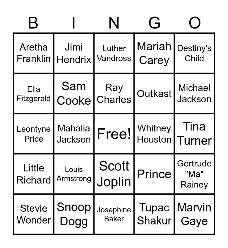 This bingo card has a free space and 25 words: Louis Armstrong, Josephine Baker, Ray Charles, Stevie Wonder, Destiny's Child, Aretha Franklin, Ella Fitzgerald, Jimi Hendrix, Whitney Houston, Scott Joplin, Outkast, Leontyne Price, Prince, Gertrude "Ma" Rainey, Sam Cooke, Nina Simone, Tina Turner, Luther Vandross, Michael Jackson, Mahalia Jackson, Marvin Gaye, Snoop Dogg, Little Richard, Mariah Carey and Tupac Shakur.