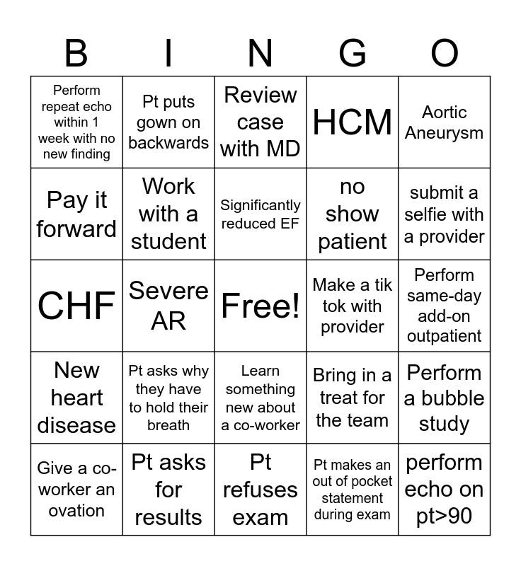 This bingo card has a free space and 24 words: Give a co-worker an ovation, Pt asks why they have to hold their breath, Significantly reduced EF, Pt makes an out of pocket statement during exam, Aortic Aneurysm, Perform repeat echo within 1 week with no new finding, Pt puts gown on backwards, Review case with MD, Make a tik tok with provider, Perform same-day add-on outpatient, CHF, Work with a student, Bring in a treat for the team, Perform a bubble study, Pay it forward, Pt asks for results, Pt refuses exam, HCM, submit a selfie with a provider, New heart disease, Severe AR, Learn something new about a co-worker, no show patient and perform echo on pt>90.