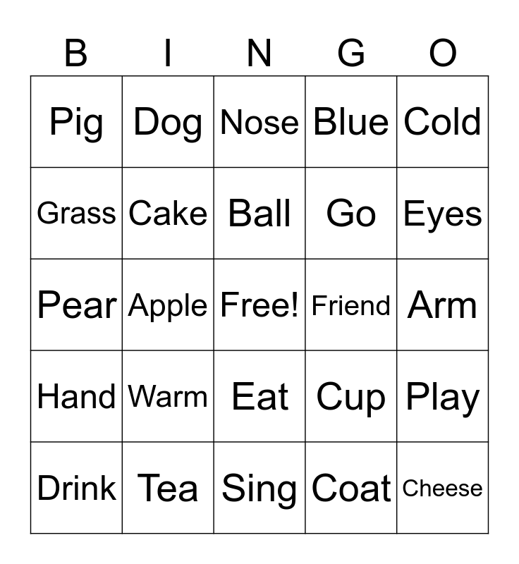 This bingo card has a free space and 24 words: Warm, Tea, Ball, Drink, Cold, Pig, Grass, Dog, Friend, Eat, Go, Pear, Cup, Play, Cake, Coat, Arm, Nose, Eyes, Apple, Cheese, Hand, Blue and Sing.