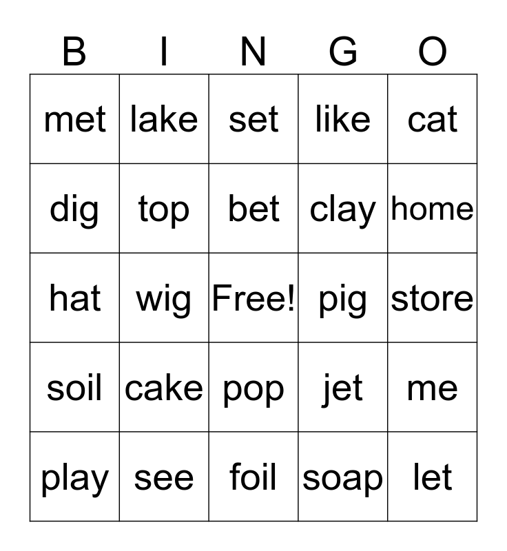 This bingo card has a free space and 24 words: cake, see, bet, play, cat, met, dig, lake, pig, pop, clay, hat, jet, me, top, soap, store, set, home, wig, let, soil, like and foil.