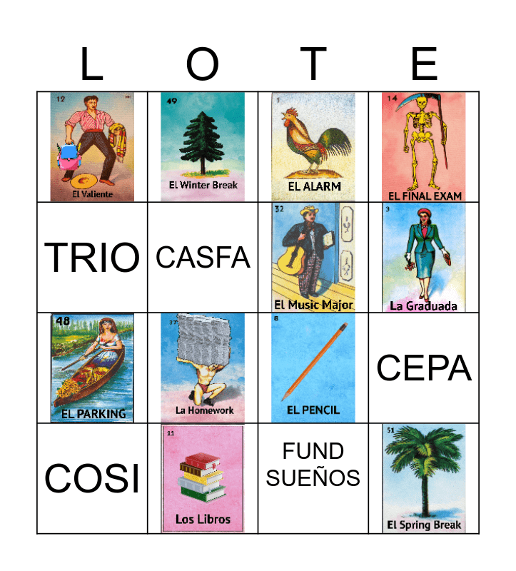 This bingo card has 16 images and 6 words: COSI, CASFA, FUND SUEÑOS, CEPA, TRIO and Access Coordinator.