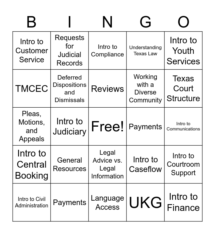 This bingo card has a free space and 24 words: General Resources, Payments, Reviews, Intro to Civil Administration, Intro to Youth Services, Intro to Customer Service, TMCEC, Requests for Judicial Records, Payments, Legal Advice vs. Legal Information, Working with a Diverse Community, Pleas, Motions, and Appeals, Intro to Caseflow, Intro to Courtroom Support, Deferred Dispositions and Dismissals, UKG, Intro to Communications, Intro to Compliance, Texas Court Structure, Intro to Judiciary, Intro to Finance, Intro to Central Booking, Understanding Texas Law and Language Access.