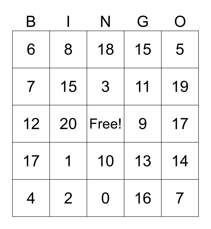 This bingo card has a free space and 24 words: 1, 2, 3, 4, 5, 6, 7, 8, 9, 10, 11, 12, 13, 14, 15, 16, 17, 18, 19, 20, 7, 17, 15 and 0.