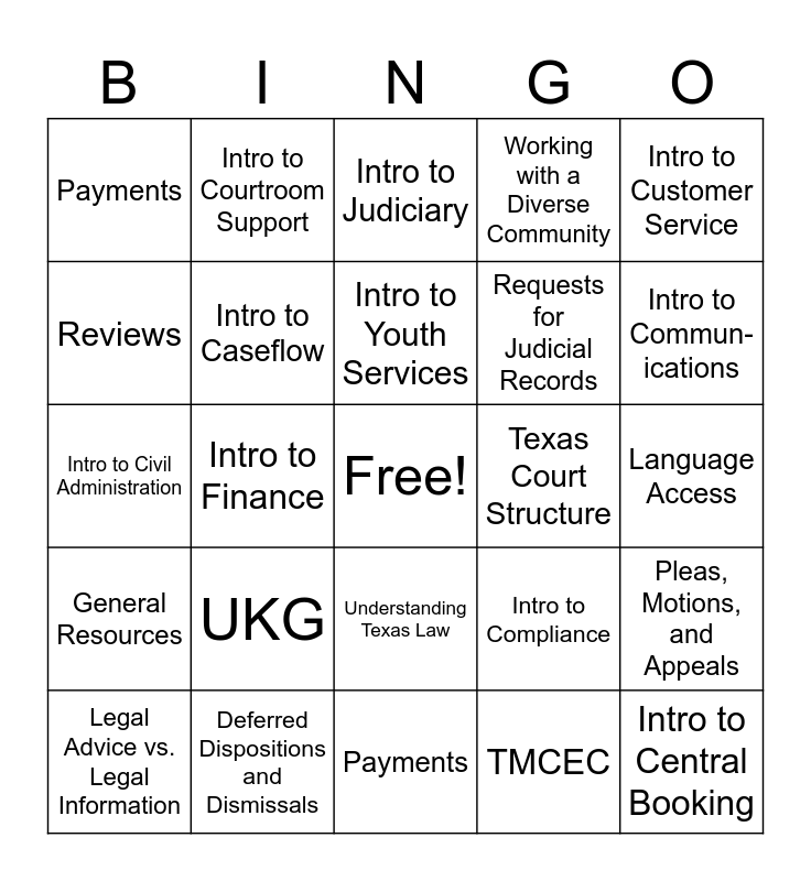 This bingo card has a free space and 24 words: UKG, Deferred Dispositions and Dismissals, Intro to Youth Services, Legal Advice vs. Legal Information, Intro to Customer Service, Payments, Reviews, Intro to Courtroom Support, Texas Court Structure, Understanding Texas Law, Requests for Judicial Records, Intro to Civil Administration, Intro to Compliance, Pleas, Motions, and Appeals, Intro to Caseflow, TMCEC, Language Access, Intro to Judiciary, Intro to Commun-ications, Intro to Finance, Intro to Central Booking, General Resources, Working with a Diverse Community and Payments.