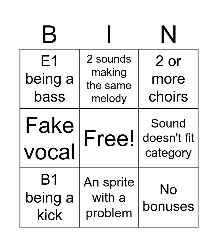 This bingo card has a free space and 8 words: Sound doesn't fit category, 2 or more choirs, 2 sounds making the same melody, B1 being a kick, E1 being a bass, No bonuses, Fake vocal and An sprite with a problem.