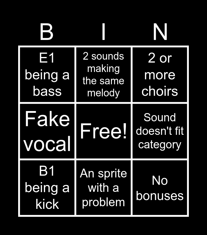This bingo card has a free space and 8 words: Sound doesn't fit category, 2 or more choirs, 2 sounds making the same melody, B1 being a kick, E1 being a bass, No bonuses, Fake vocal and An sprite with a problem.