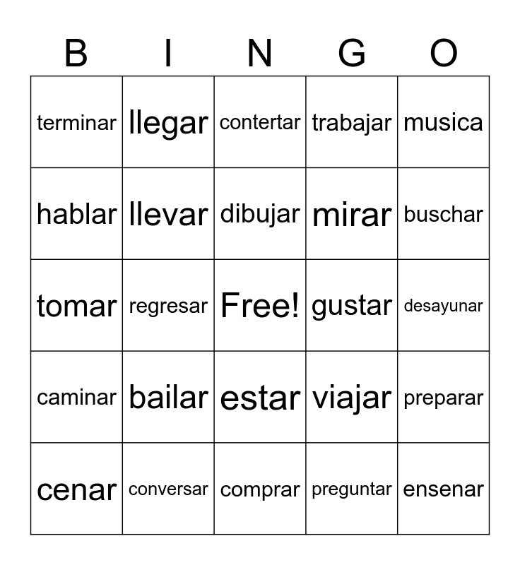 This bingo card has a free space and 24 words: bailar, conversar, dibujar, cenar, musica, terminar, hablar, llegar, gustar, estar, mirar, tomar, viajar, preparar, llevar, preguntar, desayunar, contertar, buschar, regresar, ensenar, caminar, trabajar and comprar.
