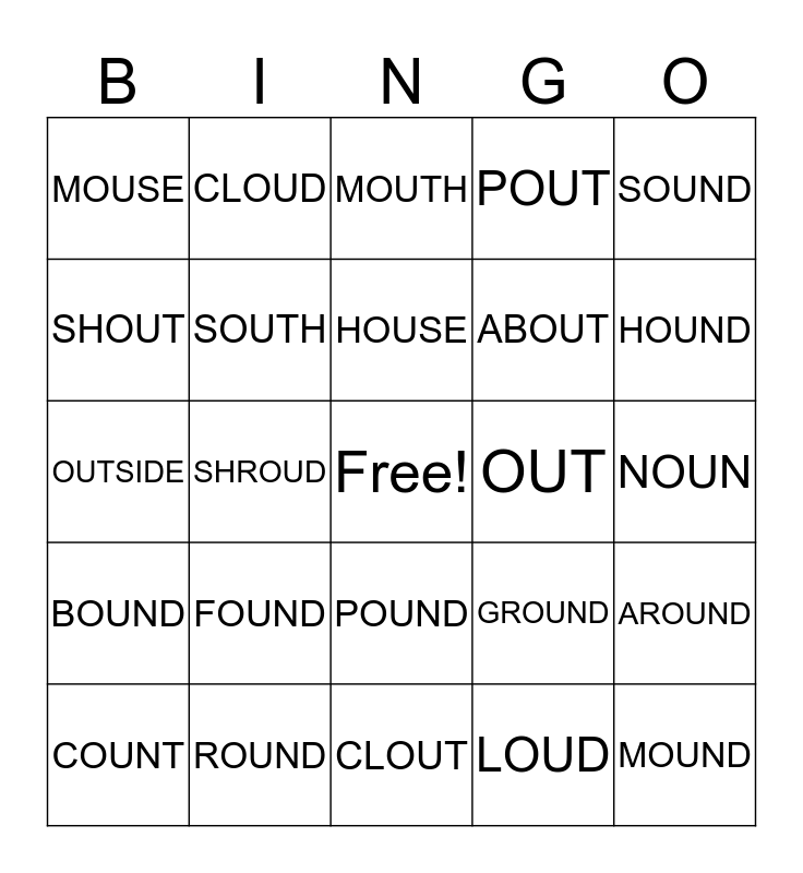 This bingo card has a free space and 24 words: FOUND, ROUND, HOUSE, COUNT, SOUND, MOUSE, SHOUT, CLOUD, OUT, POUND, ABOUT, OUTSIDE, GROUND, AROUND, SOUTH, LOUD, NOUN, MOUTH, HOUND, SHROUD, MOUND, BOUND, POUT and CLOUT.
