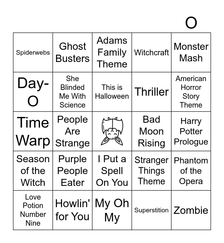 This bingo card has a free space and 26 words: I Put a Spell On You, Superstition, This is Halloween, Howlin' for You, Monster Mash, Spiderwebs, Day-O, Ghost Busters, Harry Potter Prologue, Stranger Things Theme, Thriller, Time Warp, Phantom of the Opera, Love Potion Number Nine, People Are Strange, Poor Unfortunate Souls, Witchcraft, Season of the Witch, Adams Family Theme, Zombie, American Horror Story Theme, My Oh My, Bad Moon Rising, Purple People Eater, She Blinded Me With Science and I Want Candy.