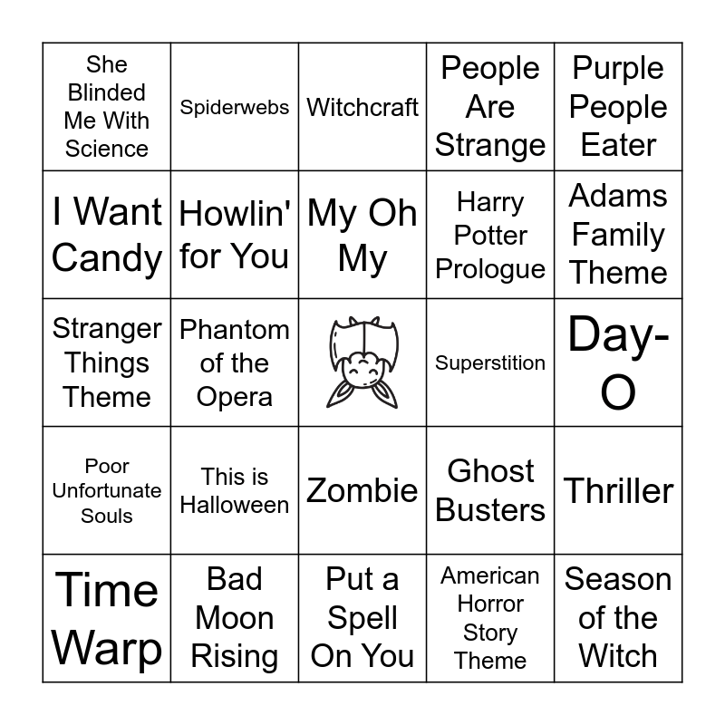 This bingo card has a free space and 26 words: Zombie, American Horror Story Theme, My Oh My, Bad Moon Rising, Purple People Eater, She Blinded Me With Science, I Want Candy, Spiderwebs, Day-O, Ghost Busters, Harry Potter Prologue, Stranger Things Theme, Thriller, Time Warp, Phantom of the Opera, Love Potion Number Nine, People Are Strange, Poor Unfortunate Souls, Witchcraft, Season of the Witch, Adams Family Theme, Put a Spell On You, Superstition, This is Halloween, Howlin' for You and Monster Mash.
