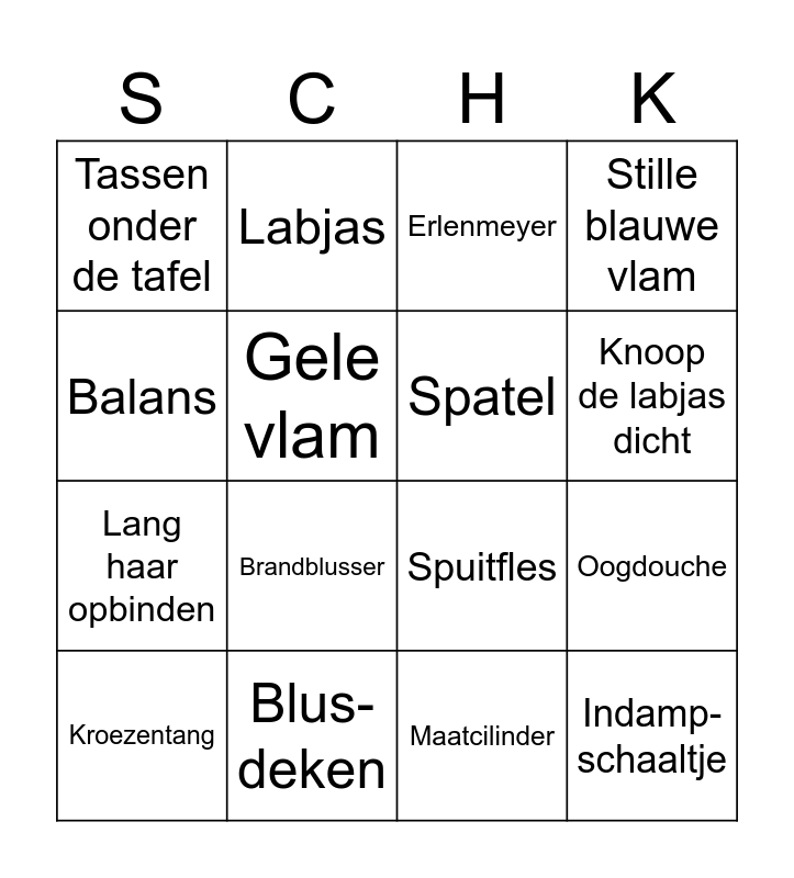 This bingo card has 30 words: Bekerglas, Houten knijper, Oogdouche, Veiligheids-bril, Tassen onder de tafel, Erlenmeyer, Spatel, Gasknop van de brander, Blus-deken, Luchtring, Maatcilinder, Kroezentang, Werk staand, Roer-staafje, Brandblusser, Niet eten en/of drinken, Reageer-buisje, Indamp-schaaltje, Trechter, Balans, Spuitfles, Brander, Labjas, Lang haar opbinden, Gele vlam, Stille blauwe vlam, Ruisende vlam, Roet/ zwart, Knoop de labjas dicht and Hand koelen met koud stromend water.