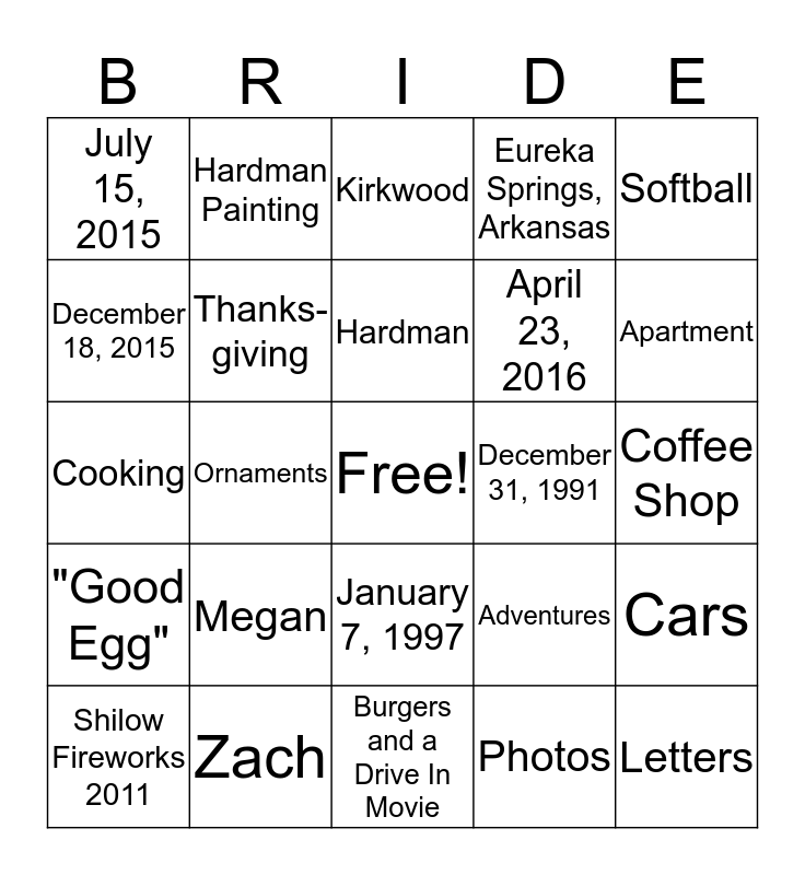 This bingo card has a free space and 24 words: Megan, Zach, Hardman, Shilow Fireworks 2011, Softball, July 15, 2015, December 18, 2015, Hardman Painting, December 31, 1991, January 7, 1997, April 23, 2016, Cooking, Adventures, Cars, Thanks- giving, Photos, Coffee Shop, Kirkwood, Apartment, Ornaments, Letters, "Good Egg", Eureka Springs, Arkansas and Burgers and a Drive In Movie.