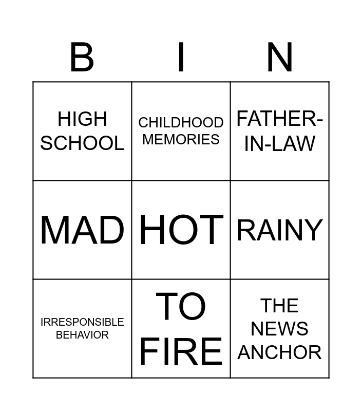 This bingo card has 9 words: IRRESPONSIBLE BEHAVIOR, FATHER-IN-LAW, CHILDHOOD MEMORIES, MAD, HIGH SCHOOL, RAINY, HOT, THE NEWS ANCHOR and TO FIRE.