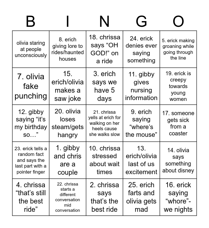 This bingo card has 25 words: 1. gibby and chris are a couple, 2. chrissa says that’s the best ride, 3. erich says we have 5 days, 4. chrissa “that’s still the best ride”, 5. erick making groaning while going through the line, olivia staring at people unconsciously, 7. olivia fake punching, 8. erich giving lore to rides/haunted houses, 9. erich saying “where’s the mouse”, 10. chrissa stressed about wait times, 11. gibby gives nursing information, 12. gibby saying “it’s my birthday so…”, 13. erich/olivia last of us excitement, 14. olivia says something about disney, 15. erich/olivia makes a saw joke, 16. erick saying “whore”-we nights, 17. someone gets sick from a coaster, 18. chrissa says “OH GOD!” on a ride, 19. erick is creepy towards young women, 20. olivia loses steam/gets hangry, 21. chrissa yells at erich for walking on her heels cause she walks slow, 22. chrissa starts a different conversation mid conversation, 23. erick tells a random fact and says the last part with a pointer finger, 24. erick denies ever saying something and 25. erich farts and olivia gets mad.