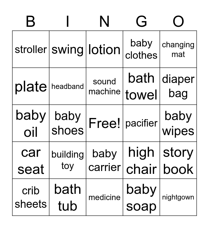 This bingo card has a free space and 70 words: diaper, baby wipes, diaper cream, onesie, bath tub, rattle, baby clothes, socks, changing mat, baby powder, story book, bib, stroller, lotion, baby spoon, baby shoes, baby carrier, bath towel, burp cloth, car seat, pacifier, high chair, diaper bag, activity mat, baby blanket, mobile, bath toys, crib, baby soap, bowl, swing, sleep sack, sippy cup, stuffed animal, night light, bassinet, hat, picture frame, first aid kit, plate, gift card, building toy, nightgown, baby monitor, safety plugs, headband, crib sheets, swaddle, sweatshirt, leggings, romper, vest, pacifinder, toothbrush, medicine, teether, sound machine, bubble bath, rubber duck, washcloth, baby oil, bottle brush, bottle rack, bottles, boppy, car mirror, hangers, thermometer, snack cup and sunscreen.