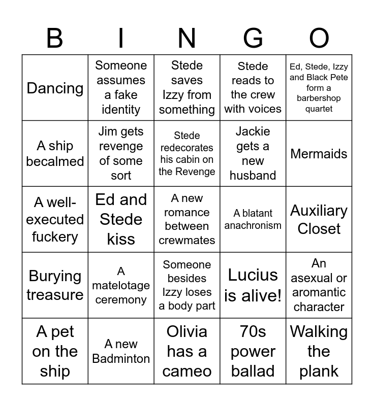 This bingo card has 25 words: A matelotage ceremony, Olivia has a cameo, Stede redecorates his cabin on the Revenge, A pet on the ship, Ed, Stede, Izzy and Black Pete form a barbershop quartet, Dancing, A ship becalmed, Someone assumes a fake identity, A blatant anachronism, Someone besides Izzy loses a body part, Jackie gets a new husband, A well-executed fuckery, Lucius is alive!, An asexual or aromantic character, Jim gets revenge of some sort, Walking the plank, Auxiliary Closet, Stede saves Izzy from something, Mermaids, Ed and Stede kiss, A new romance between crewmates, A new Badminton, Burying treasure, Stede reads to the crew with voices and 70s power ballad.