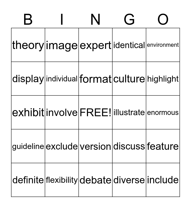 This bingo card has a free space and 24 words: exclude, flexibility, format, definite, environment, theory, display, image, illustrate, version, culture, exhibit, discuss, feature, individual, diverse, enormous, expert, highlight, involve, include, guideline, identical and debate.