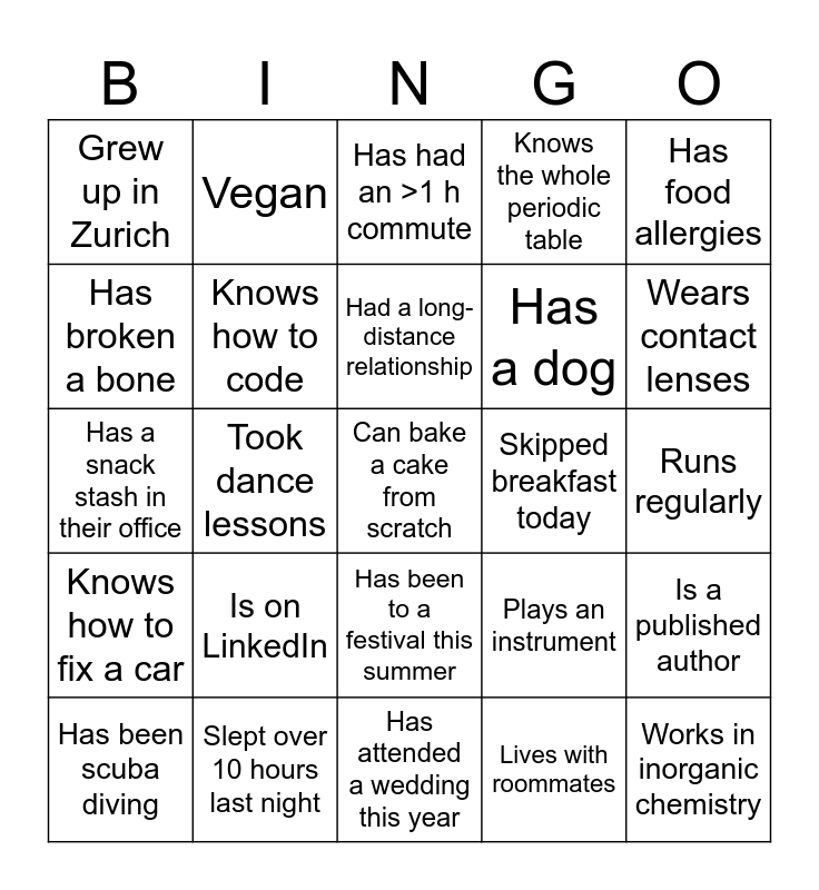 This bingo card has 75 words: Drinks more than three coffees per day, Does not like fondue, Has had an >1 h commute, Can do a cartwheel, Loves true crime podcasts, Works in microbiology, Taught a class, Is wearing funny socks, Same birth month as you, Never learned to ride a bike, Works in inorganic chemistry, Collects something, Had a long-distance relationship, Has broken a bone, Speaks more than two languages, Took dance lessons, Sends Christmas cards, Can bake a cake from scratch, Has a motorbike driver's license, Has food allergies, Ran in a marathon, Has a snack stash in their office, Knows how to code, Vegan, Knows the whole periodic table, Knows how to surf, Likes pineapple on pizza, Has attended a WiNS event, Bikes to work/university, Works out before work/lectures, Is an only child, Twin or triplet, Is not from Europe, Plays an instrument, Wears contact lenses, Has a dog, Has changed their subject, Works in theoretical physics, Runs regularly, Lives with roommates, Has never been to a concert, Has a tattoo, Is left-handed, Has been to Disneyland, Vegetarian, Has a Master's degree, Has been scuba diving, Grew up in Zurich, Has a sweet tooth, Has an unusual hobby, Has met someone famous, Has been to a festival this summer, Loves classical music, Has won a race/competition, Procrastinates, Has been skydiving, Has lived in more than three countries, Likes really spicy food, Knows how to skii/snowboard, Had braces as a kid, Is on LinkedIn, Has no unread emails, Ordered take-out in the past 5 days, Got up before 6.30 am this morning, Has a side-job, Skipped breakfast today, Knows martial arts, Has been a mentor/mentee before, Screams during scary movies, Is a published author, Knows how to fix a car, Slept over 10 hours last night, Has a work/studying playlist, Has attended a wedding this year and Has a middle name.
