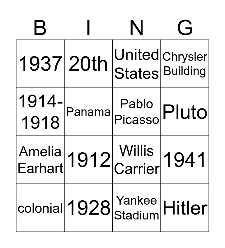 This bingo card has a free space and 15 words: colonial, Hitler, United States, 1937, Pluto, 1914-1918, 1912, Yankee Stadium, Panama, Amelia Earhart, 1941, Chrysler Building, Pablo Picasso, 20th and 1928.