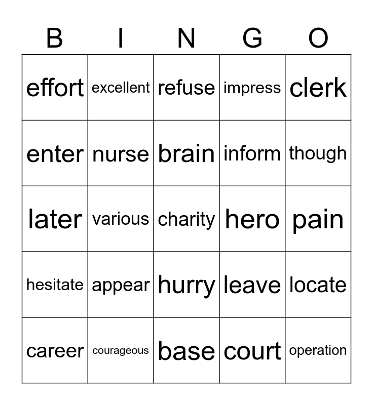 This bingo card has 25 words: appear, base, brain, career, clerk, effort, enter, excellent, hero, hurry, inform, later, leave, locate, nurse, operation, pain, refuse, though, various, charity, courageous, hesitate, impress and court.