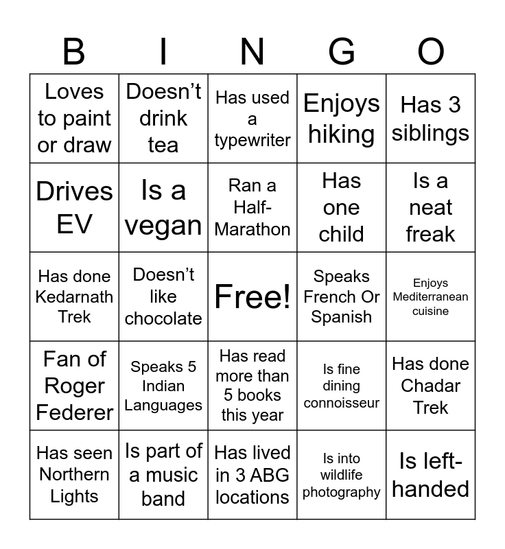 This bingo card has a free space and 50 words: Has a cat, Is left-handed, Tried Para Gliding, Has lived in 3 ABG locations, Speaks 5 Indian Languages, Has never played candy crush, Doesn’t drink tea, Has been to 15 countries, Drives EV, Has a Dog, Is a vegan, Enjoys hiking, Has done Chadar Trek, Is fine dining connoisseur, Has Zip lined, Tried Para Sailing, Ran a Half-Marathon, Speaks French Or Spanish, Has been Scuba Diving, Has 3 siblings, Doesn’t like chocolate, Is into wildlife photography, Loves to paint or draw, Has one child, Can’t swim, Loves gardening, Is a neat freak, Is a fitness enthusiast, Has used a typewriter, Has read more than 5 books this year, Can skate, Watches reality TV Show, Same birth month as you, Done solo backpacking trip, Is part of a music band, Is a Rock & Roll fan, Loves Ghazals, Has played a sport at state level, Has published an article, Enjoys Mediterranean cuisine, Enjoys Italian Cuisine, Enjoys Thai Cuisine, Plays guitar, Has visited Eiffel tower., Has seen Northern Lights, Has done Kedarnath Trek, Has worked abroad, Plays Football, Fan of Roger Federer and Fan of Messi.