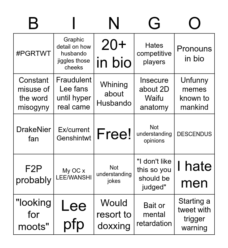This bingo card has a free space and 24 words: My OC x LEE/WANSHI, Lee pfp, Whining about Husbando, "looking for moots", Pronouns in bio, #PGRTWT, Constant misuse of the word misogyny, Graphic detail on how husbando jiggles those cheeks, Not understanding opinions, Not understanding jokes, Insecure about 2D Waifu anatomy, DrakeNier fan, "I don't like this so you should be judged", I hate men, Fraudulent Lee fans until hyper real came, Bait or mental retardation, DESCENDUS, 20+ in bio, Unfunny memes known to mankind, Ex/current Genshintwt, Starting a tweet with trigger warning, F2P probably, Hates competitive players and Would resort to doxxing.