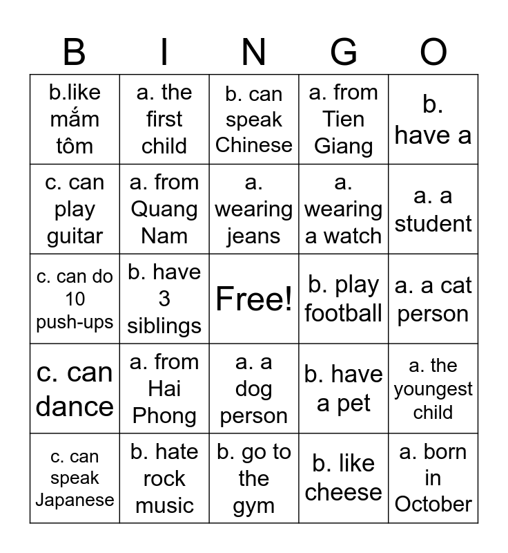 This bingo card has a free space and 24 words: a. from Hai Phong, b. hate rock music, a. wearing jeans, c. can speak Japanese, b. have a, b.like mắm tôm, c. can play guitar, a. the first child, b. play football, a. a dog person, a. wearing a watch, c. can do 10 push-ups, b. have a pet, a. the youngest child, a. from Quang Nam, b. like cheese, a. a cat person, b. can speak Chinese, a. a student, b. have 3 siblings, a. born in October, c. can dance, a. from Tien Giang and b. go to the gym.