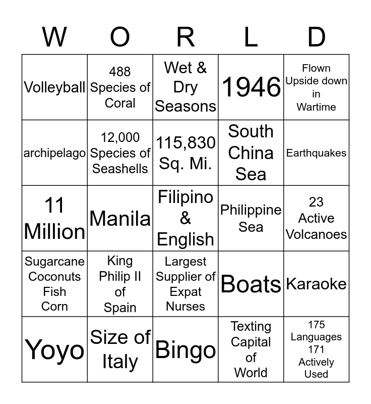 This bingo card has 31 words: Bingo, Pedicab, Manila, 7107 Islands, Volleyball, Wet & Dry Seasons, 12,000 Species of Seashells, Boats, Philippine Sea, Texting Capital of World, 23 Active Volcanoes, Filipino & English, 175 Languages 171 Actively Used, 8th Wonder of the World, Earthquakes, Don't Open Yet, Karaoke, King Philip II of Spain, Sugarcane Coconuts Fish Corn, Largest Supplier of Expat Nurses, Flown Upside down in Wartime, Average year round temp. 81, Yoyo, 488 Species of Coral, South China Sea, archipelago, 1946, 11 Million, Size of Italy, 115,830 Sq. Mi. and 12th most Populace.