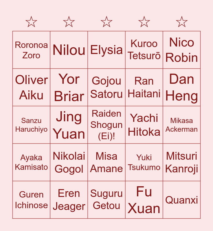 This bingo card has 25 words: Nikolai Gogol, Suguru Getou, Gojou Satoru, Guren Ichinose, Nico Robin, Roronoa Zoro, Oliver Aiku, Nilou, Yachi Hitoka, Misa Amane, Ran Haitani, Sanzu Haruchiyo, Yuki Tsukumo, Mitsuri Kanroji, Yor Briar, Quanxi, Mikasa Ackerman, Elysia, Dan Heng, Jing Yuan, Raiden Shogun (Ei)!, Eren Jeager, Ayaka Kamisato, Kuroo Tetsurō and Fu Xuan.