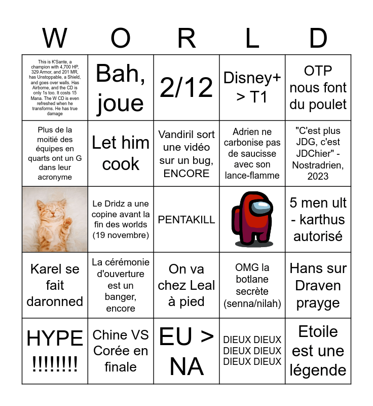 This bingo card has 2 images, a free space and 22 words: HYPE !!!!!!!!, La cérémonie d'ouverture est un banger, encore, Vandiril sort une vidéo sur un bug, ENCORE, DIEUX DIEUX DIEUX DIEUX DIEUX DIEUX, OTP nous font du poulet, This is K'Sante, a champion with 4,700 HP, 329 Armor, and 201 MR, has Unstoppable, a Shield, and goes over walls. Has Airborne, and the CD is only 1s too. It costs 15 Mana. The W CD is even refreshed when he transforms. He has true damage, Bah, joue, 2/12, 5 men ult - karthus autorisé, Let him cook, OMG la botlane secrète (senna/nilah), Hans sur Draven prayge, Plus de la moitié des équipes en quarts ont un G dans leur acronyme, Chine VS Corée en finale, EU > NA, Disney+ > T1, "C'est plus JDG, c'est JDChier" -Nostradrien, 2023, Karel se fait daronned, Le Dridz a une copine avant la fin des worlds (19 novembre), On va chez Leal à pied, Adrien ne carbonise pas de saucisse avec son lance-flamme and Etoile est une légende.