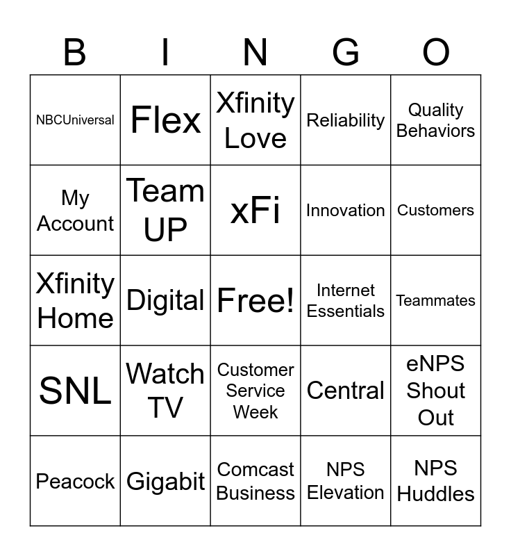 This bingo card has a free space and 42 words: Xfinity, xFi, Voice Remote, Watch TV, NPS Elevation, eNPS Shout Out, NPS Huddles, NPS Callbacks, Xfinity Love, Customer Service Week, Teammates, Customers, Digital, Quality Behaviors, Northeast, Central, West, Xfinity Home, Xfinity Mobile, Flex, My Account, Festive Fleet, Your Voice, NBCUniversal, Sky, Cable, Innovation, Entertainment, Media, 1963, The Tonight Show, SNL, Team UP, Comcast Business, Focus Features, Peacock, Gigabit, Internet Essentials, Integrity, Accessibility, Reliability and Xchange.