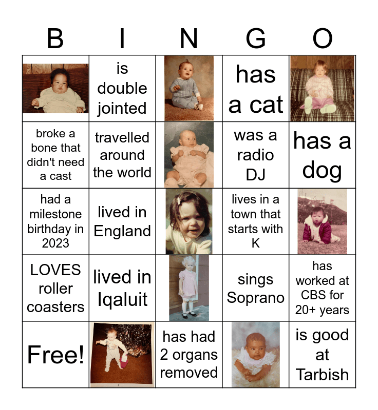 This bingo card has 10 images and 17 words: sings Soprano, is good at Tarbish, was a radio DJ, has had 2 organs removed, broke a bone that didn't need a cast, is double jointed, LOVES roller coasters, lives in a town that starts with K, has worked at CBS for 20+ years, had a milestone birthday in 2023, has a cat, Free!, has a dog, knows what Tarbish is, travelled around the world, lived in Iqaluit and lived in England.