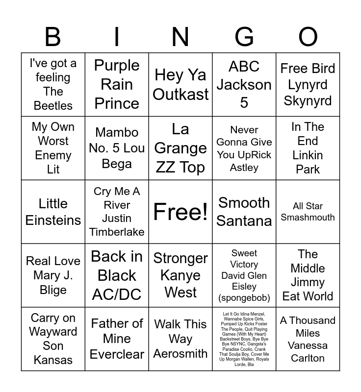 This bingo card has a free space and 25 words: Back in Black AC/DC, Walk This Way Aerosmith, La Grange ZZ Top, Carry on Wayward Son Kansas, Free Bird Lynyrd Skynyrd, I've got a feeling The Beetles, My Own Worst Enemy Lit, Purple Rain Prince, Smooth Santana, Stronger Kanye West, Never Gonna Give You UpRick Astley, Little Einsteins, Sweet Victory David Glen Eisley (spongebob), The Middle Jimmy Eat World, Mambo No. 5 Lou Bega, Take Me Home, Country Roads John Denver, All Star Smashmouth, Hey Ya Outkast, In The End Linkin Park, Cry Me A River Justin Timberlake, A Thousand Miles Vanessa Carlton, Father of Mine Everclear, Real Love Mary J. Blige, ABC Jackson 5 and Let It Go Idina Menzel, Wannabe Spice Girls, Pumped Up Kicks Foster The People, Quit Playing Games (With My Heart) Backstreet Boys, Bye Bye Bye NSYNC, Gangsta's Paradise Coolio, Crank That Soulja Boy, Cover Me Up Morgan Wallen, Royals Lorde, Bla.