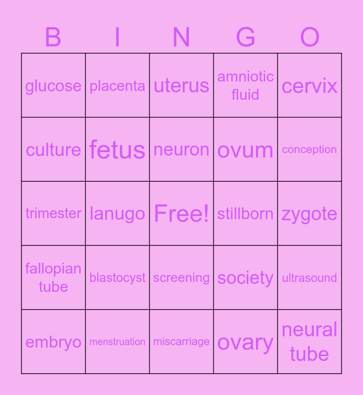 This bingo card has a free space and 24 words: blastocyst, menstruation, neuron, embryo, cervix, glucose, culture, placenta, stillborn, screening, ovum, trimester, society, ultrasound, fetus, ovary, zygote, uterus, conception, lanugo, neural tube, fallopian tube, amniotic fluid and miscarriage.