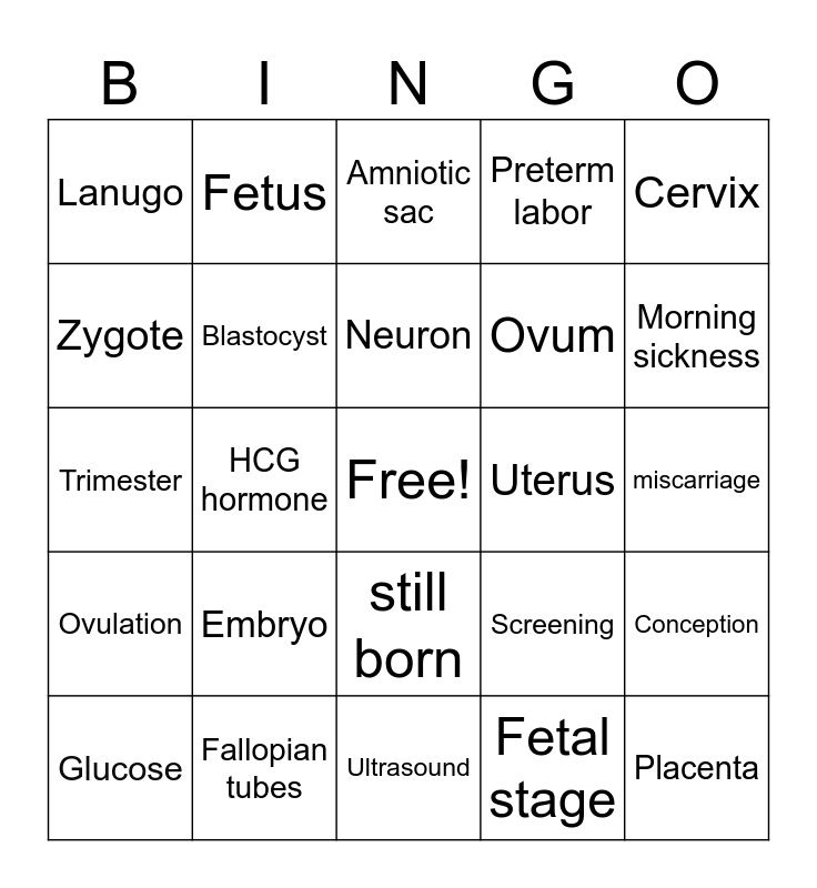 This bingo card has a free space and 24 words: Embryo, Fallopian tubes, Neuron, Glucose, Cervix, Lanugo, Zygote, Fetus, Uterus, still born, Ovum, Trimester, Screening, Conception, Blastocyst, Fetal stage, miscarriage, Amniotic sac, Morning sickness, HCG hormone, Placenta, Ovulation, Preterm labor and Ultrasound.