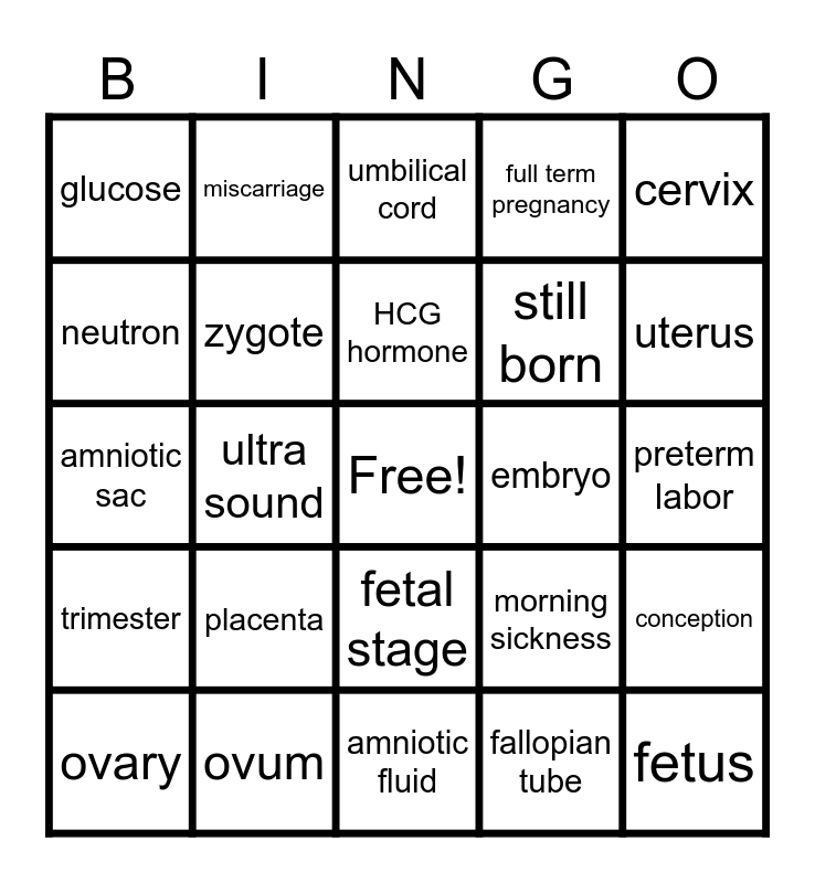 This bingo card has a free space and 24 words: placenta, ovum, HCG hormone, ovary, cervix, glucose, neutron, miscarriage, embryo, fetal stage, still born, amniotic sac, morning sickness, conception, zygote, fallopian tube, preterm labor, umbilical cord, uterus, ultra sound, fetus, trimester, full term pregnancy and amniotic fluid.