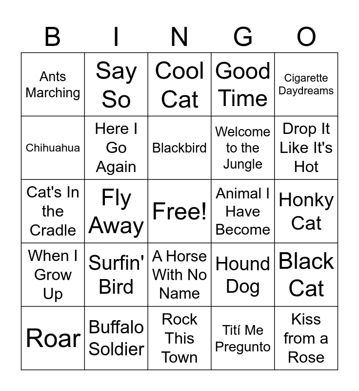 This bingo card has a free space and 26 words: A Horse With No Name, Tití Me Pregunto, Blackbird, Buffalo Soldier, Cigarette Daydreams, Ants Marching, Chihuahua, Say So, Honky Cat, Hound Dog, Welcome to the Jungle, Cat's In the Cradle, Black Cat, Roar, Fly Away, Animal, Good Time, When I Grow Up, Cool Cat, Kiss from a Rose, Drop It Like It's Hot, Rock This Town, Animal I Have Become, Surfin' Bird, Here I Go Again and Float On.