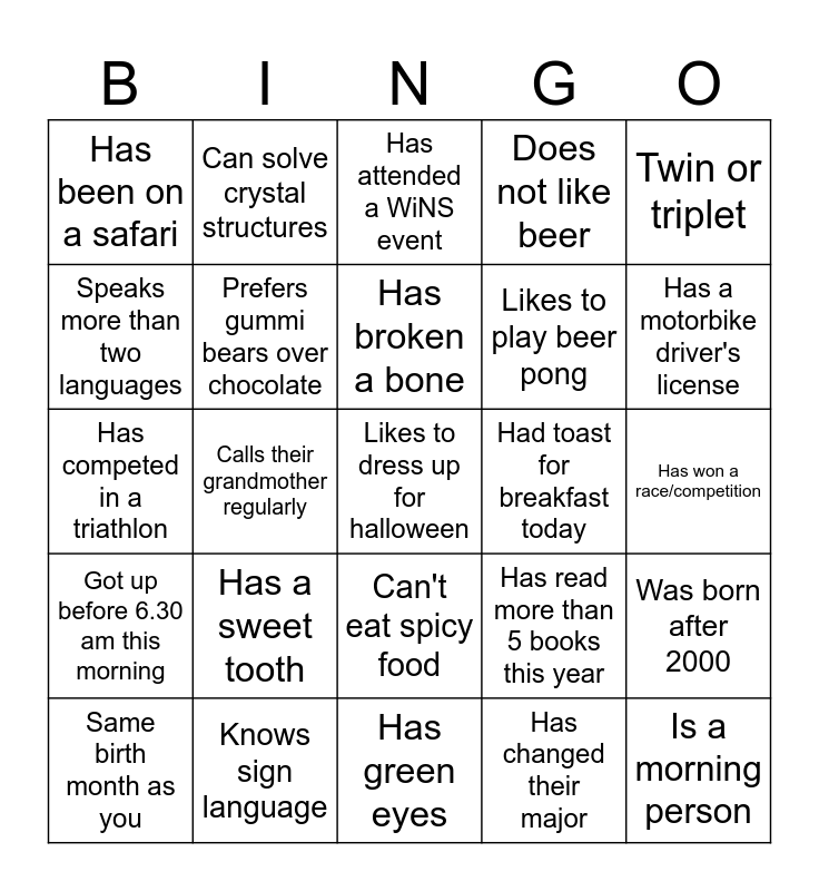 This bingo card has a free space and 74 words: Did all of their studies at the same university, Likes pineapple on pizza, Has attended a WiNS event, Can do a cartwheel, Watches the news daily, Works in organic chemistry, Taught a class, Is wearing funny socks, Same birth month as you, Did not go to high school in their home city, Prefers theoretical work over experimental, Collects something, Has broken a bone, Speaks more than two languages, Knows how to dance salsa, Calls their grandmother regularly, Will bake Christmas cookies, Has a motorbike driver's license, Can do a backflip, Has competed in a triathlon, Prefers gummi bears over chocolate, Can solve crystal structures, Does not like beer, Knows the whole periodic table, Is a morning person, Does not like raclette, Has had an >1 h commute, Takes the bus to uni, Likes to go clubbing, Knows how to do DFT, Twin or triplet, Is not from Europe, Plays an instrument, Has visited the Great Wall of China, Has a dog, Has changed their major, Works in physical chemistry, Runs regularly, Lives with roommates, Has never been to a concert, Has green eyes, Knows sign language, Has been on the Eifel tower, Their favourite colour is blue, Has a Bachelor's degree, Has been on a safari, Grew up in Scandinavia, Has a sweet tooth, Has an unusual hobby, Has met someone famous, Has been to a festival this summer, Loves classical music, Has won a race/competition, Procrastinates, Has been skydiving, Has lived in more than three countries, Can't eat spicy food, Cuts their own hair, Had braces as a kid, Was born after 2000, Likes to play beer pong, Has an anti-hangover routine, Got up before 6.30 am this morning, Has a side-job, Had toast for breakfast today, Knows martial arts, Has been a mentor/mentee before, Likes stand up comedy, Has read more than 5 books this year, Knows how to fix a bike, Slept over 10 hours last night, Has a work/studying playlist, Has attended a wedding this year and Has a middle name.