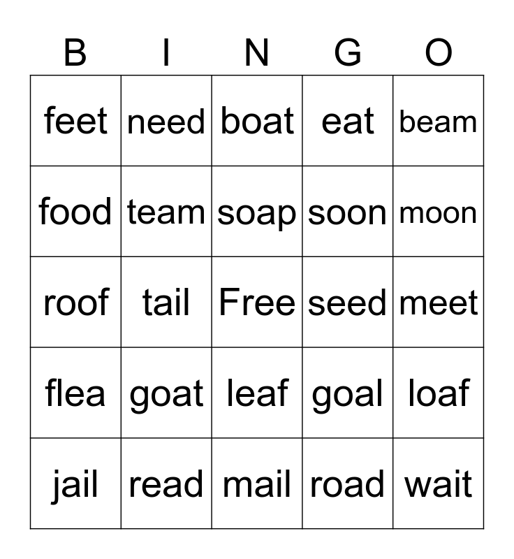 This bingo card has a free space and 24 words: goat, read, soap, jail, beam, feet, food, need, seed, leaf, soon, roof, goal, loaf, team, road, meet, boat, moon, tail, wait, flea, eat and mail.