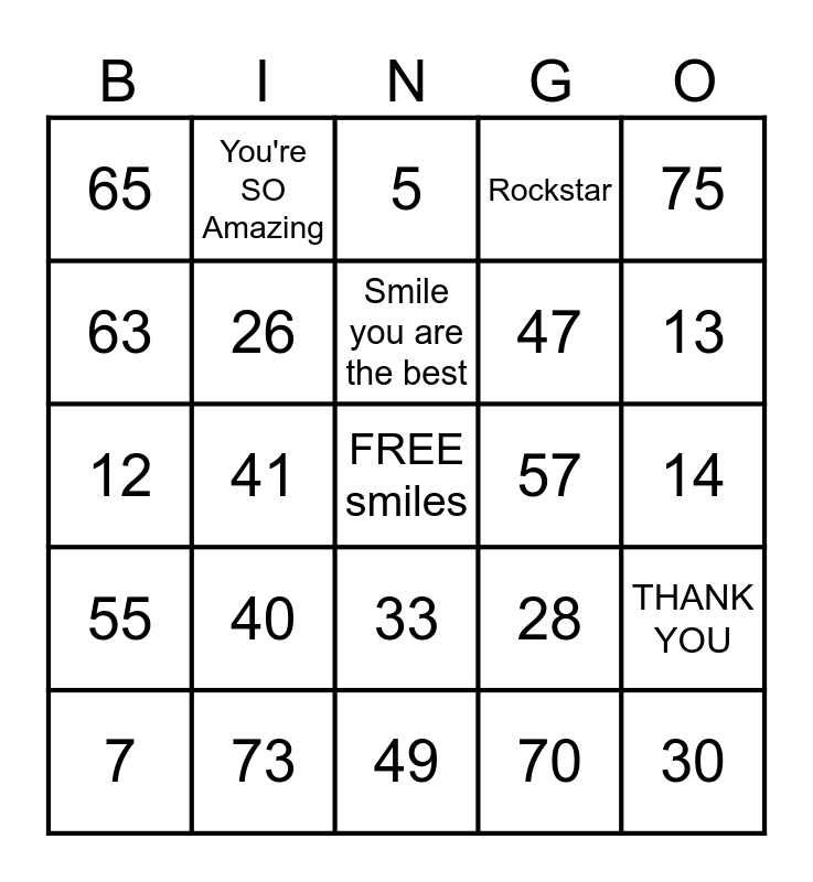 This bingo card has a free space and 29 words: 7, 16, 41, 53, 65, 5, 26, 40, 57, 73, 14, 30, 49, 70, 13, 22, 33, 55, 75, 12, 28, 42, 47, 63, Rockstar, You're SO Amazing, THANK YOU, Smile you are the best and We appreciate you.