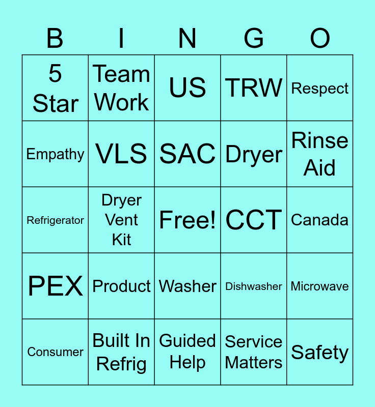 This bingo card has a free space and 25 words: Product, Guided Help, SAC, Consumer, Respect, 5 Star, Empathy, Team Work, CCT, Washer, Dryer, Refrigerator, Dishwasher, Microwave, VLS, KASA, Canada, US, Rinse Aid, Dryer Vent Kit, Safety, Built In Refrig, PEX, TRW and Service Matters.