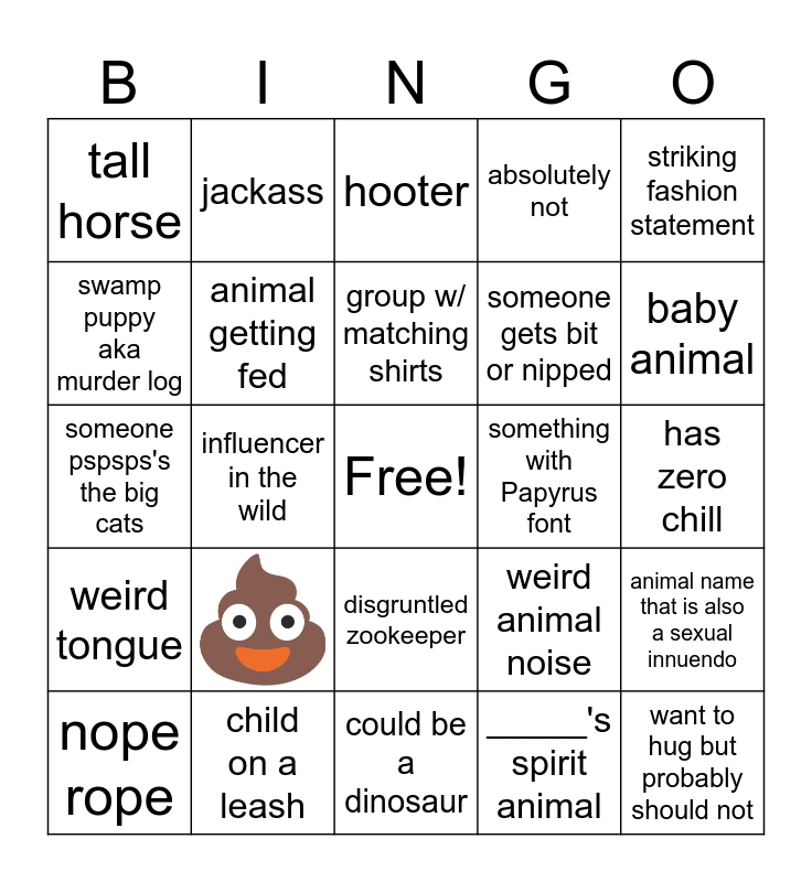 This bingo card has 1 images, a free space and 23 words: child on a leash, group w/ matching shirts, nope rope, striking fashion statement, tall horse, swamp puppy aka murder log, jackass, something with Papyrus font, disgruntled zookeeper, someone gets bit or nipped, someone pspsps's the big cats, weird animal noise, animal name that is also a sexual innuendo, animal getting fed, _____'s spirit animal, has zero chill, hooter, baby animal, influencer in the wild, want to hug but probably should not, weird tongue, absolutely not and could be a dinosaur.