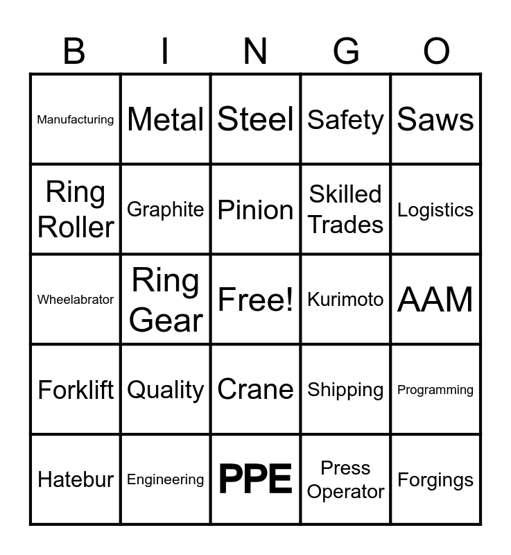 This bingo card has a free space and 24 words: Quality, Engineering, Pinion, Hatebur, Saws, Manufacturing, Ring Roller, Metal, Kurimoto, Crane, Skilled Trades, Wheelabrator, Shipping, Programming, Graphite, Press Operator, AAM, Steel, Logistics, Ring Gear, Forgings, Forklift, Safety and PPE.